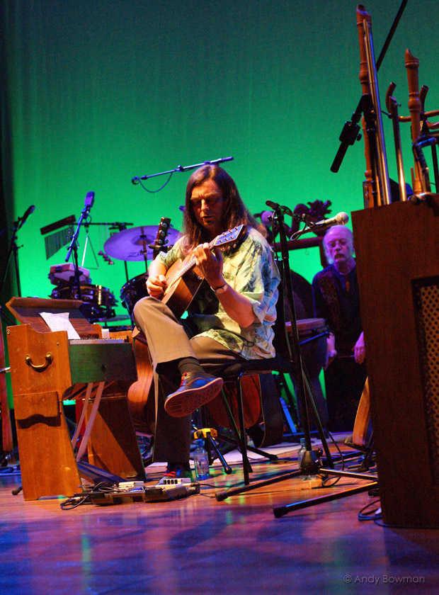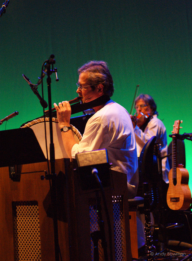 The four original four band members; Richard Harvey (recorders, crumhorns, keyboards, mandolin, ukulele, vocals and percussion), Brian Gulland (bassoon, crumhorns, recorders, harmonium, vocals, flute, and percussion), Graeme Taylor (guitars, harmonium, percussion, and vocals) and Dave Oberle (drums, percussion, and vocals) came on stage first and once the applause had died down they started with the first track of the first album “Kemp’s Jig” which was then to be followed by a selection of other tracks from “Gryphon”. The original four were later joined by Jon Davie (acoustic bass guitar, and percussion) who was the last bassist and who appeared on “Treason”, and Graham Preskett (violin, keyboards, mandolin, acoustic guitar, and percussion) who is an old friend of the band, a talented musician and composer of film music.