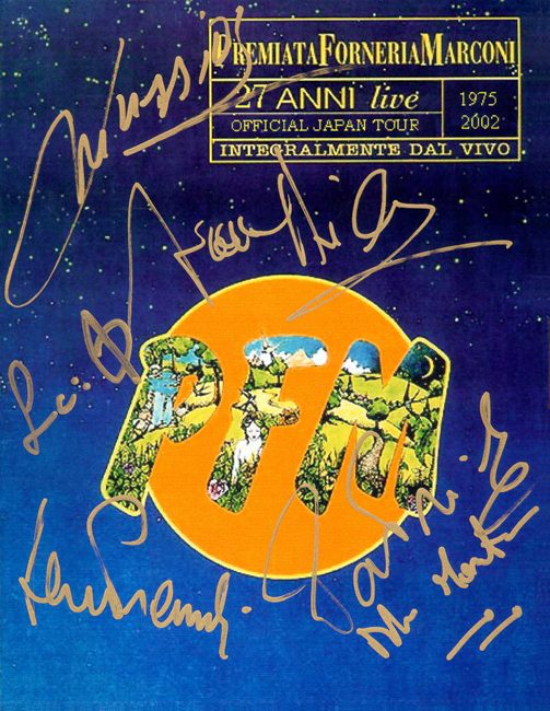 Signed in Japan, 2002: At the top, Franco Mussida; below it Franz Di Cioccio; at the left shoulder of the PFM logo, Lucio Fabbri; beneath it, Flavio Premilo; to the right overlapping the letter M of the PFM logo, Patrick Djivas; right below is Pietro Monterisi, the support drummer. (courtesy of Tatsurou Ueda) |